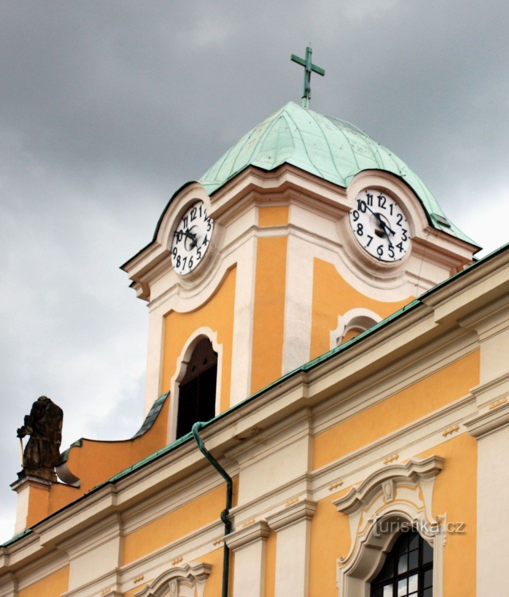 Původně gotický kostel, který vlivem pozdějších úprav získal vzhled pozdně barokní byl postaven v letech 1764 - 72 na místě staršího kostela svatého Michala ze 14. století. Na římse západního průčelí jsou po obou stranách věže umístěny sochy sv. Petra a Pavla z doby kolem roku 1770. V interiéru je nejcennější obraz na hlavním oltáři od Karla Škréty z roku 1656, který zobrazuje pannu Marii v…
