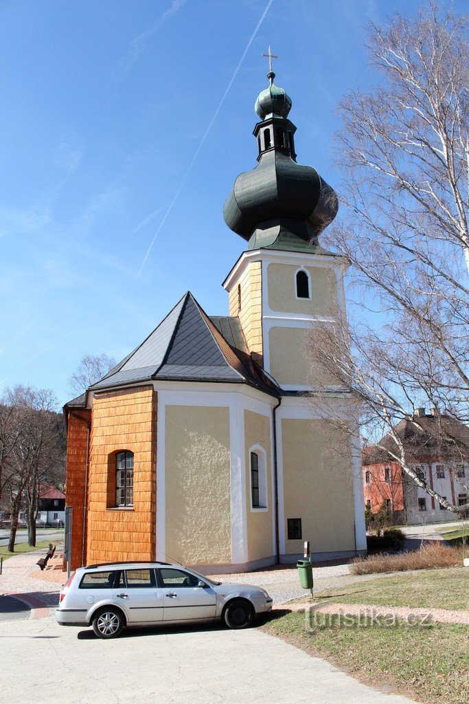 Někdy v 18. století vznikla v místech nedaleko dnešní obce Srní dřevařská osada. Nad ní byl v roce 1788 postaven dřevěný kostelík a osada se k němu postupně přibližovala. Mezi roky 1804 až 1805 byl na místě původní svatyně postaven barokní kostelík. O dva roky později byl vysvěcen. Kostel je jednoduchá, jednolodní stavba s trojbokým presbytářem, který je sklenut valenou klenbou. Hranolová věž s…