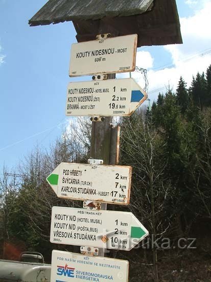 Rozcestí modré a zelené turistické značky. Nachází se na hlavní silnici na Červenohorské sedlo. Modrá značka pokračuje k dolní nádrži vodního díla Dlouhé Stráně. Po zelené značce se dostanete až na chatu Švýcárna.