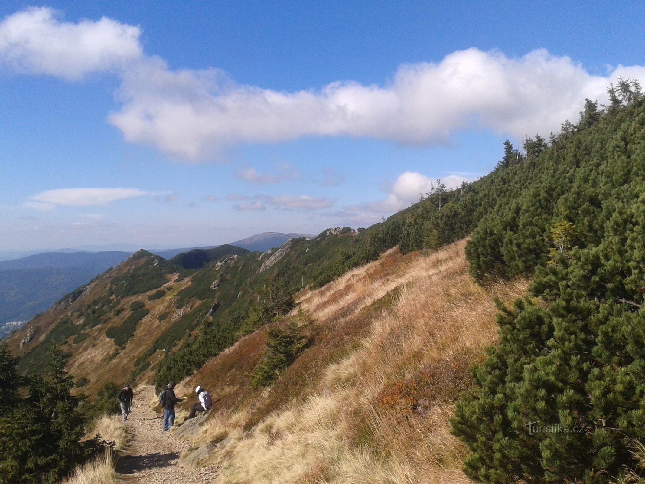 Krásné panorama Kozích hřbetů, pod kterými leží Špindlerův Mlýn.V dáli je vidět Labský důl, Labská bouda, Sněžné jámy a Vysoké kolo.Na druhé straně majestátně stojí nejvyšší hora ČR Sněžka.