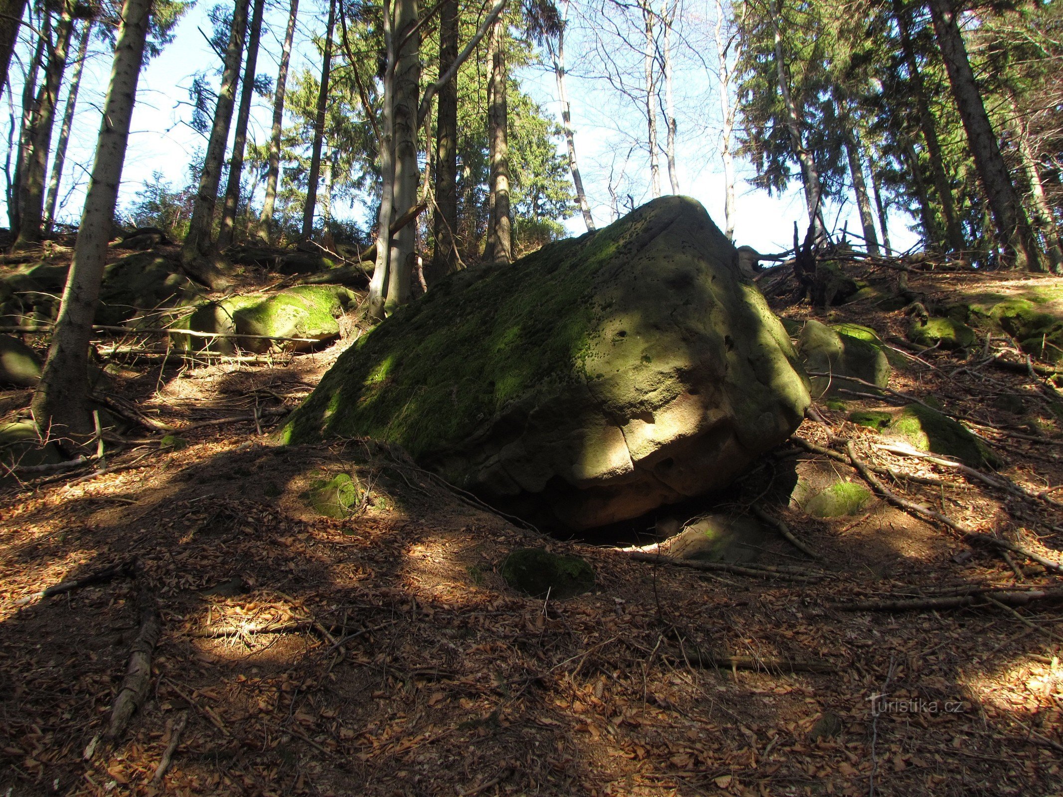 O zajímavém mrazovém srubu pod kótou Krajčice (730 m) jsem již psal. Turista, procházející od Čertových skal na hlavní hřeben Vizovických vrchů o něj není ochuzen, neboť značená cesta prochází na dohled od skaliska a pokud příchozí umí číst, je mu k dispozici i informační panel. Tato skála zde není ojedinělou záležitostí - mezi vrcholem Kopců a Krajčicí se na hřebenu nacházejí další, už menší…