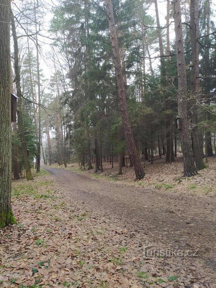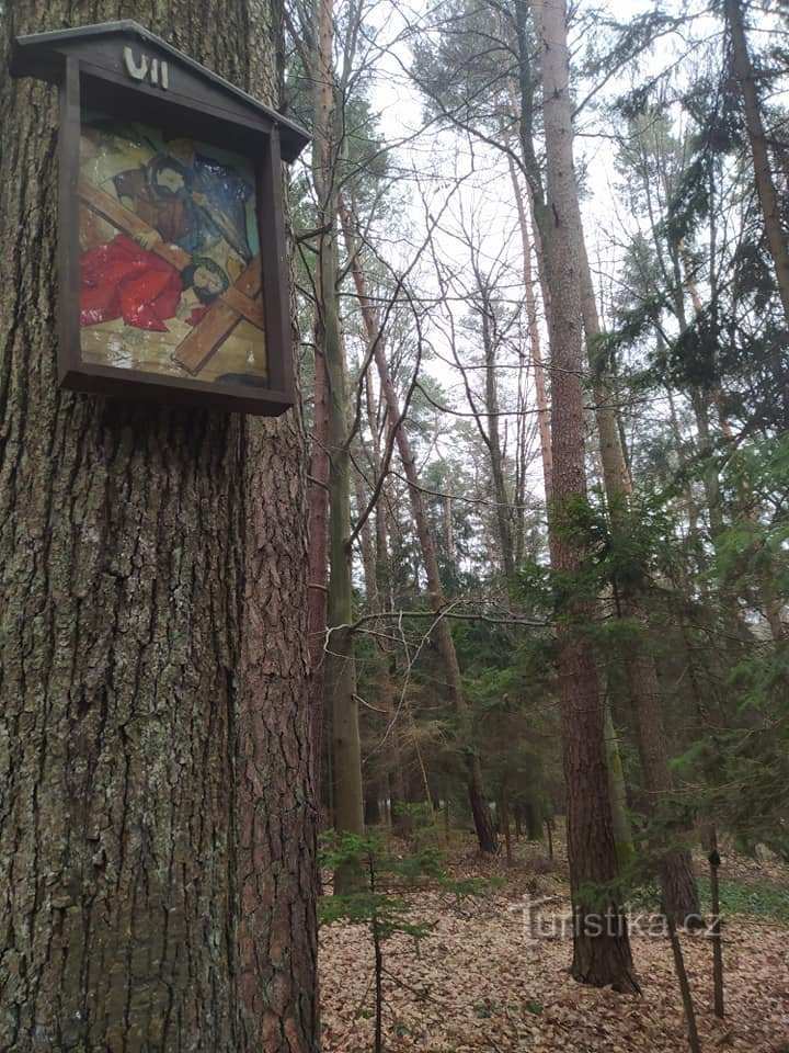 Zastavení křížové cesty tvoří obrázky zavěšené na stromech v lesním průseku. Autorem obrázků je Josef Krupík. Křížová cesta vznikla roku 2005. www.mapy.cz