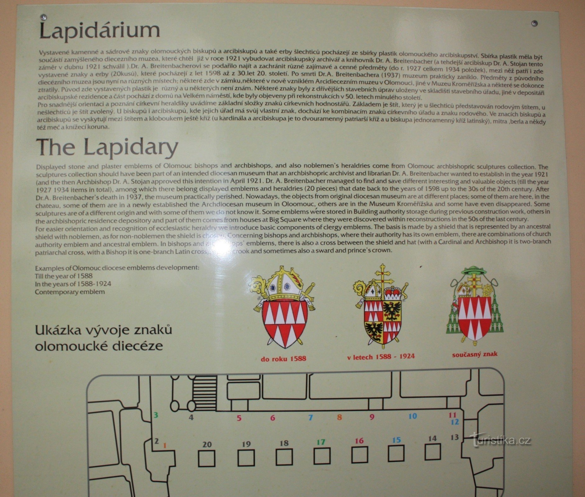 A právě takovou sbírku kamenných a sádrových znaků olomouckých biskupů a arcibiskupů ze sbírek plastik olomouckého arcibiskupství, můžeme zhlédnout na nádvoří kroměřížského zámku.