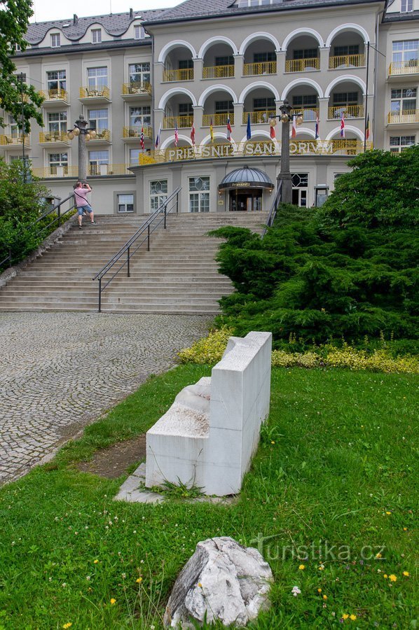 Už nějakou dobu, v aktuálním roce (2021), můžeme říci přímo 17 let zdobí prostranství před sanatoriem Priessnitz zajímavá skulptura. To prostranství musíme trošku upřesnit, je to střední teráska mezi jednotlivými úseky monumentálního schodiště, kterým se vystupuje od lázeňské promenády k samotné hlavní lázeňské budově.