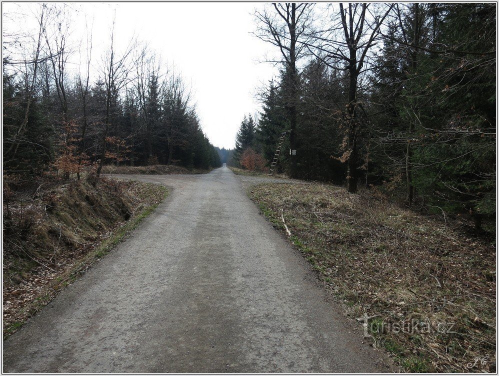 Rozcestí zelené a žluté tur. značky se nachází severně od Potštejnu v Orlických horách.