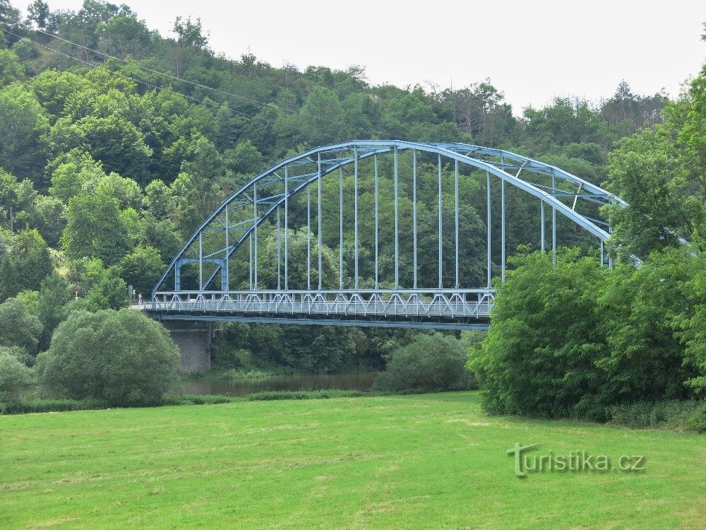 U obce – nebo spíše pod obcí – Skryje na Rakovnicku najdeme zajímavý silniční most přes řeku Berounku. Jedná se o modrý ocelový obloukový most s dolní mostovkou, který byl vyroben v severomoravských vítkovických železárnách v průběhu II. světové války.