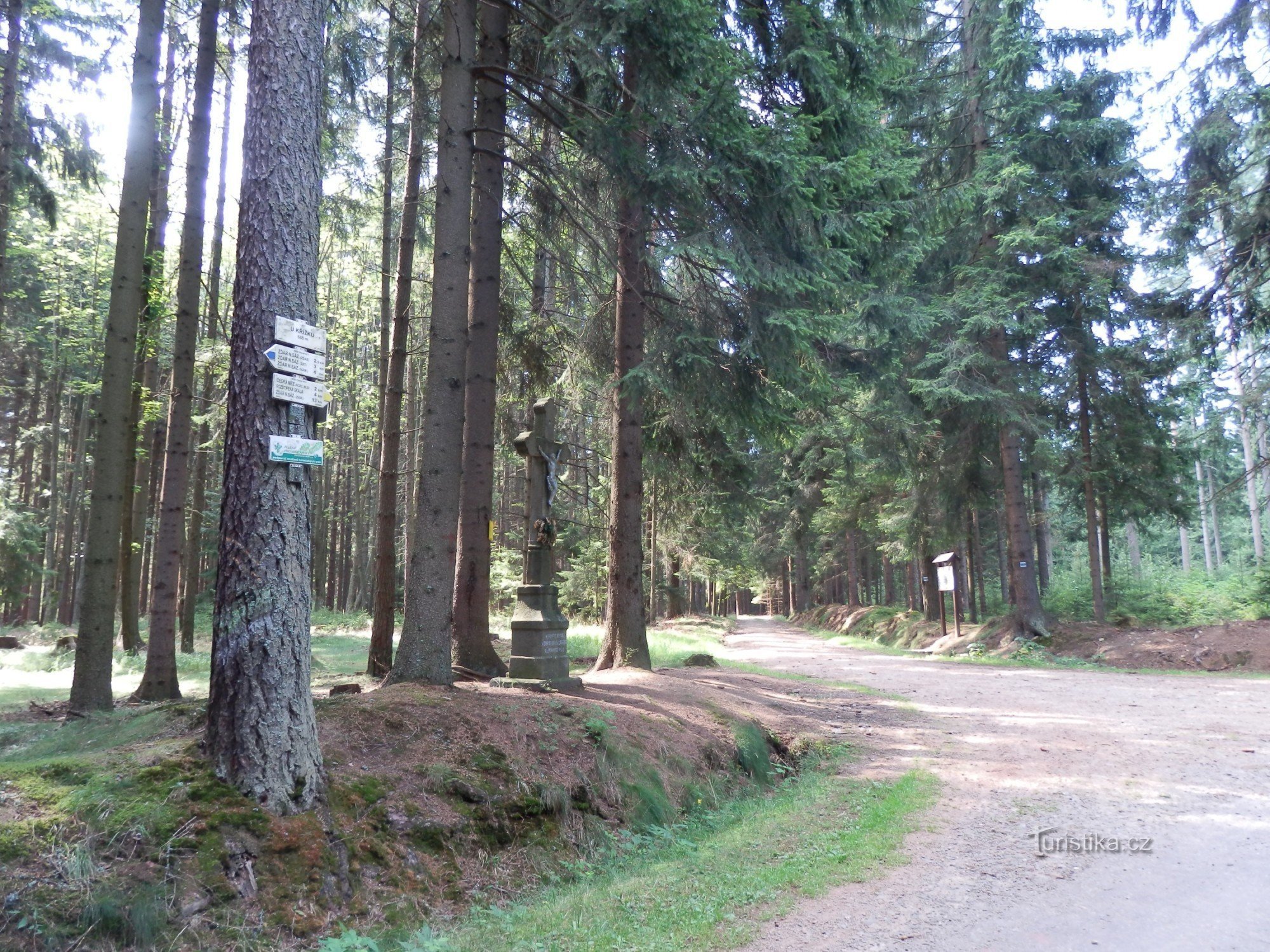Od žďárského nádraží se vydáme po modré turistické značce nejdříve půl kilometru ke strojírnám Žďas a poté kolem areálu Střední školy technické konečně do lesa, 2,5 km na Rozcestí U Křížku.