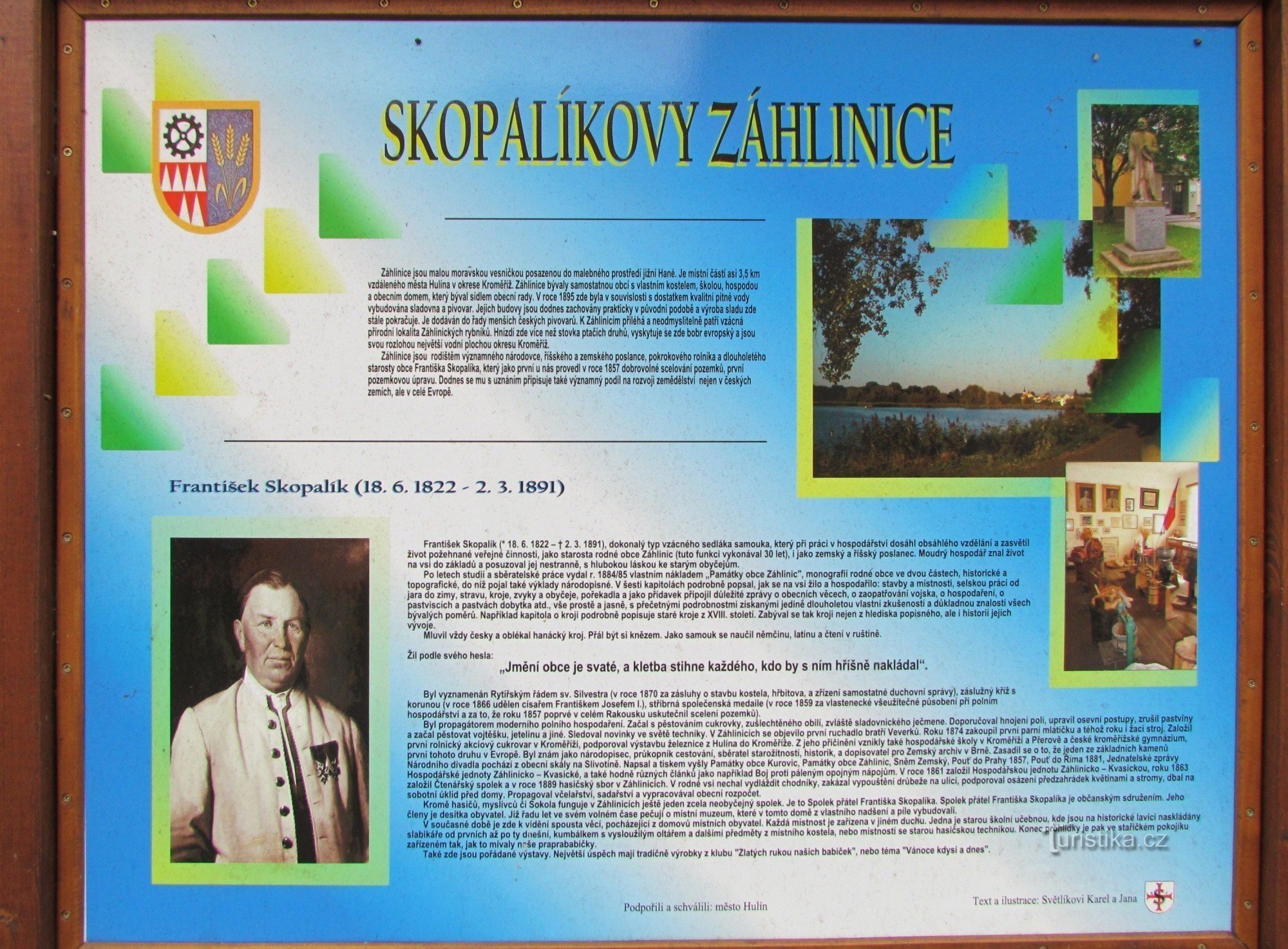 Toto muzeum bylo založeno už r.1935, za vlády komunistů ale zrušeno a jako bájný Fénix povstalo z popela až r.2007, kdy ho obnovil zdejší spolek přátel Skopalíkova muzea. Kdo to vlastně byl - ten František Skopalík? Tak tedy - byl to rodák ze Záhlinic a proslavil se jako nejvýznamnější reformátor a propagátor nových zemědělských postupů v rámci celého tehdejšího Rakousko - Uherska. Roku 1857…