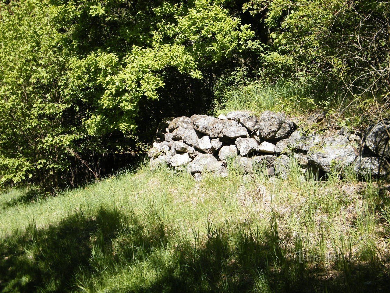 Vycházeli jsme zase po zelené, ale na opačnou stranu než včera. Chvilku po silnici, vzápětí byla odbočka Doprava, kterou chlapci zase přešli. Opět jsem je zezadu jistil. Lesní cesta vedla do kopce, ale byla poměrně přívětivá, občas přinesla výhled do kraje, nebo nějakou tu, Vaškem obdivovanou, kamennou zídku. Zelená značka vystoupala na kopec, zase z něj sestoupila k potoku, chvíli se motala…