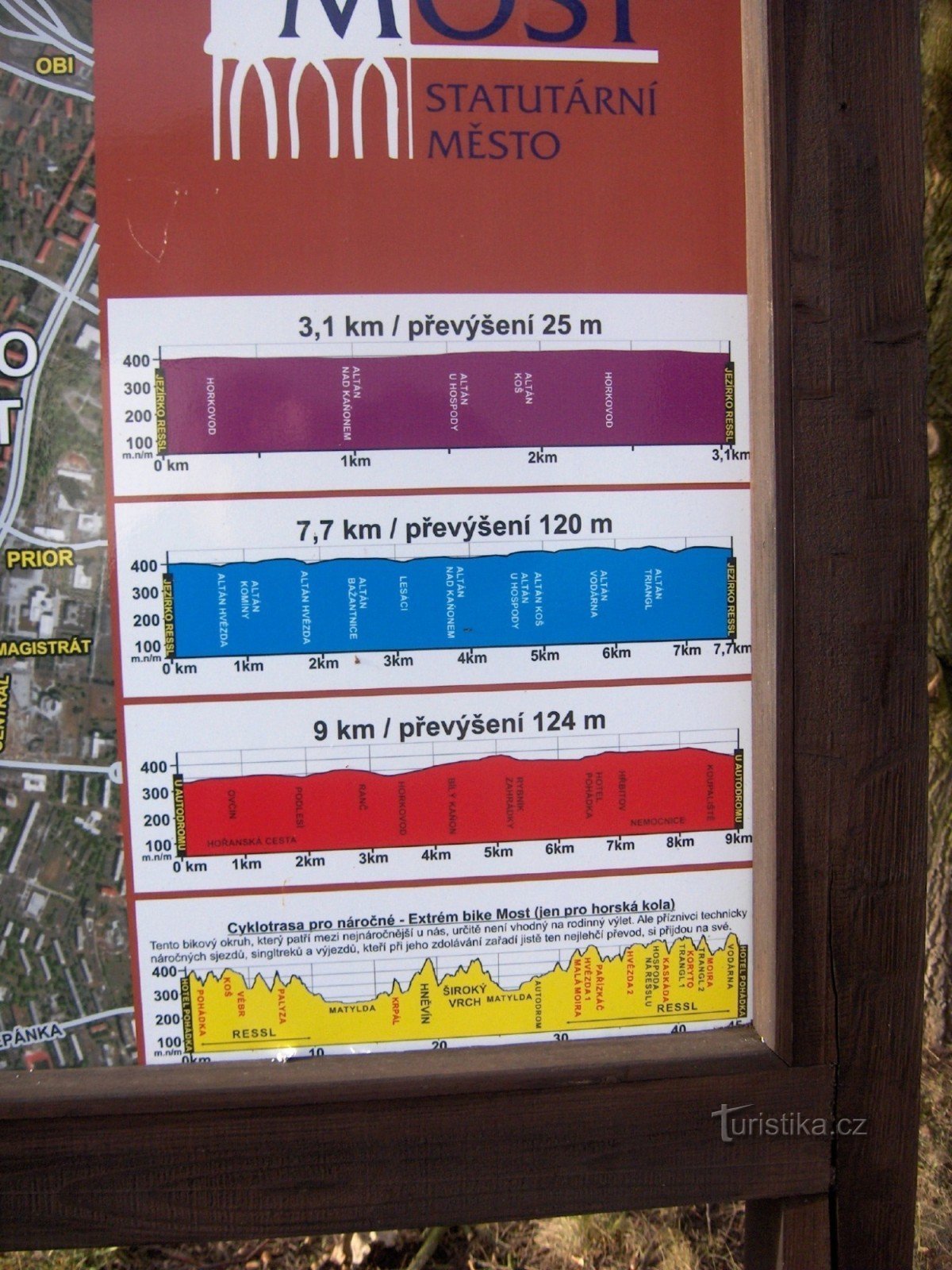 Extrémně náročná trať pro horská kola vede přes tři mostecké vrchy - Ressl, Široký vrch a Hněvín. Je značená žlutými šipkami. Strmé výšlapy a krkolomné sjezdy ji řadí mezi nejnáročnější v ČR. Okruh je dlouhý 45 km a začíná na úpatí Resslu od hotelu Pohádka.
