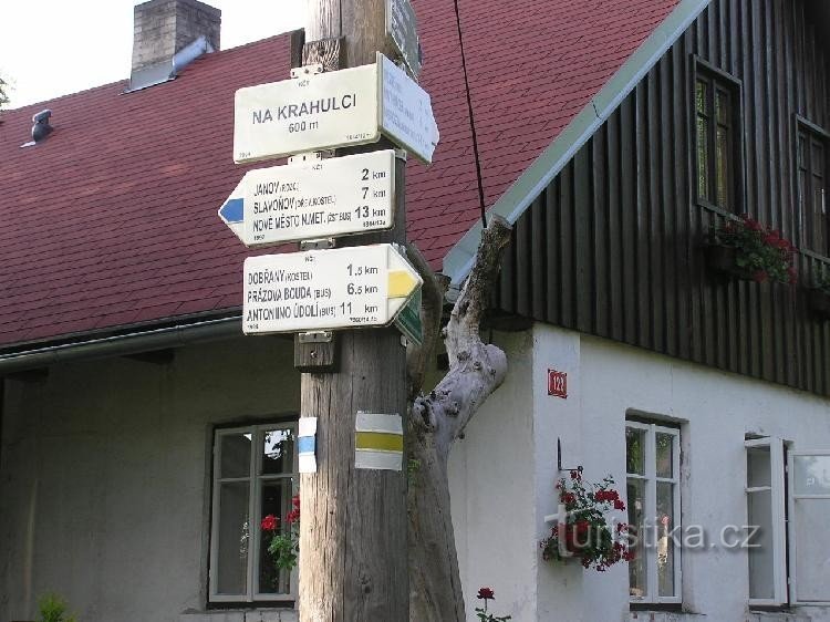 Rozcestí Na Krahulci se nachází blízko obce Sněžné v Orlických horách východně od hory Kobylinka (665 m n.m.). Vede zde modrá a žlutá turistická značka.
