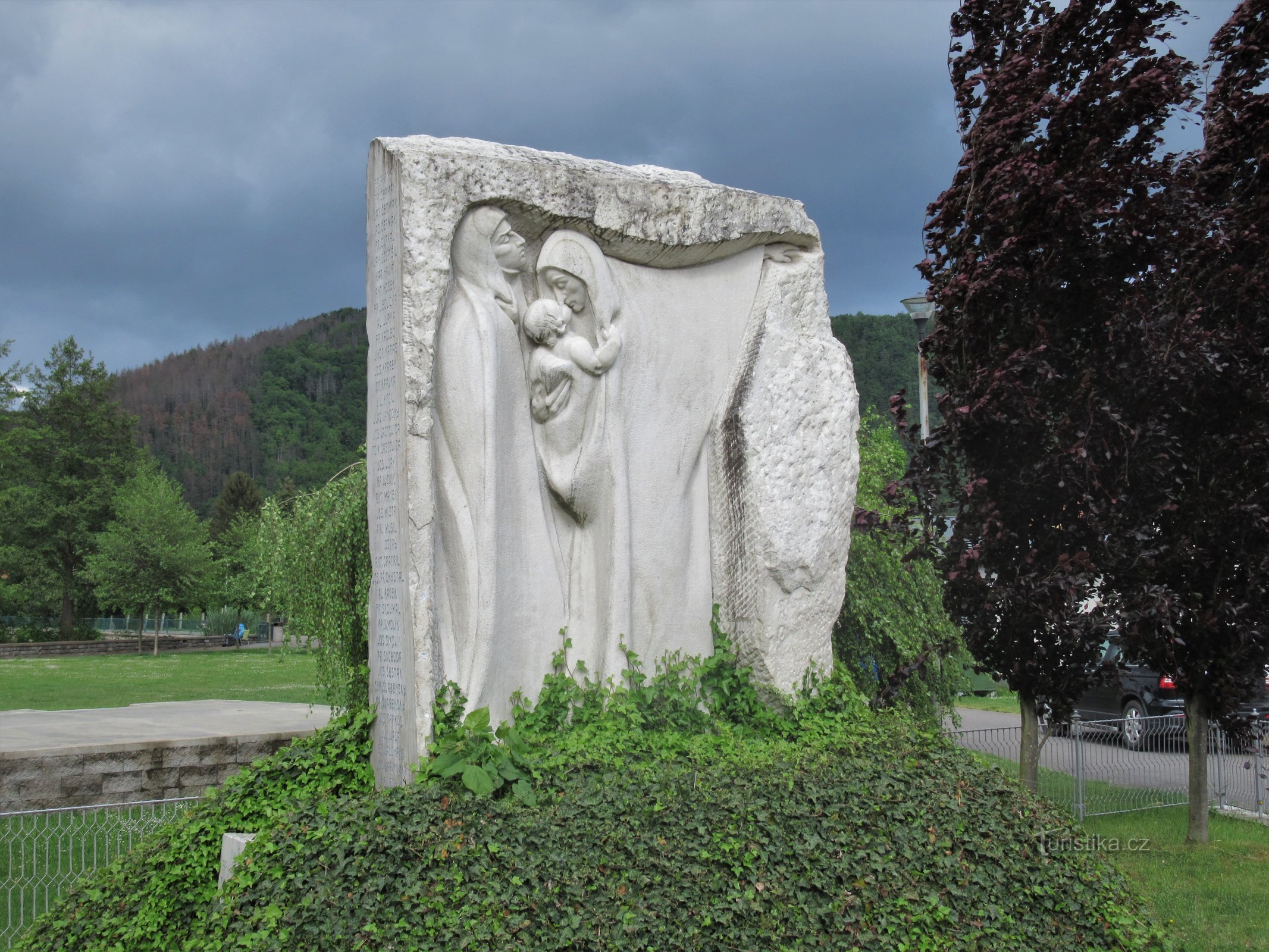 Nachází na okraji parku u rybníka v blízkosti nákupního střediska. Symbolizuje loučení legionáře s rodinou a současně představuje matku držící v náručí dítě a ukazující do dálky, kde padl její manžel a otec dítěte. Pomník upoutá svou uměleckou hodnotou a jednoduchým ztvárněním hluboké myšlenky skutku, žalu nad zbytečně promarněnými životy ve válce světových mocností. Ideový návrh na pomník…