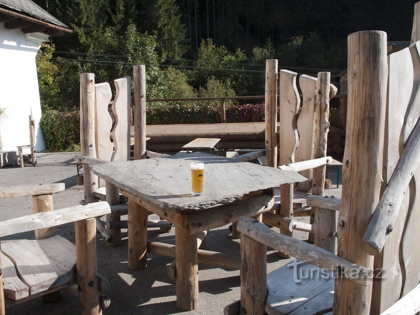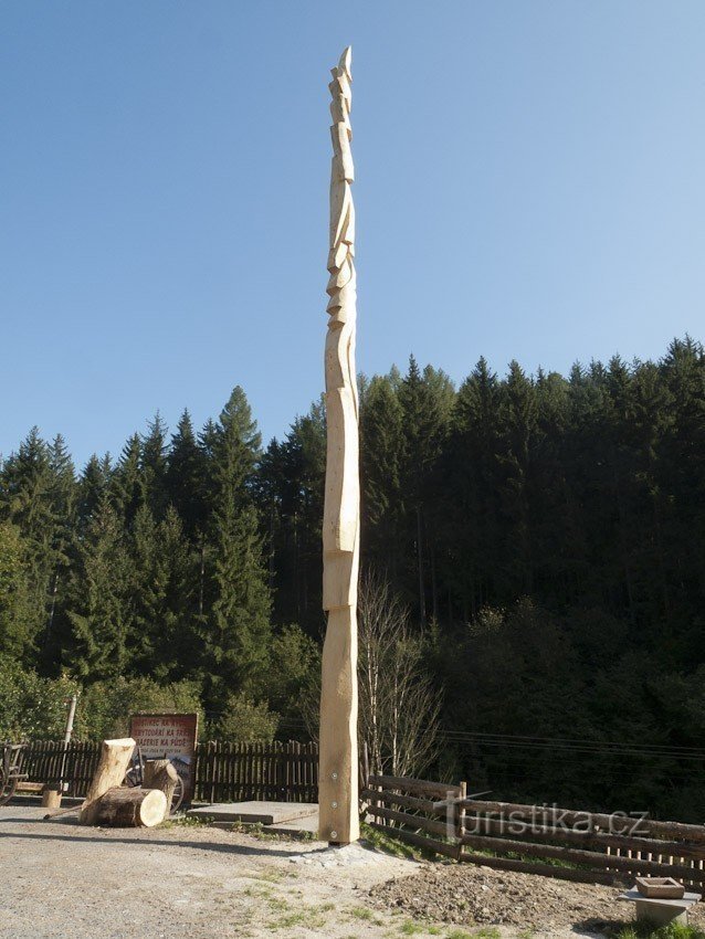 Jak praví i malá tabulka, kterou možná návštěvník objeví někde poblíž, nejvyšší dřevěnou sochu z jednoho kusu v ČR najdeme momentálně v Hanušovicích u hospody Na Rychtě. Spíš než o sochu bych napsal jakýsi dřevěný vyřezávaný artefakt který má výšku 16,4m. Dílo je vyřezáno ze smrku pokáceného někde nad Malou Moravou, lépe řečené nad osadou Sklené, údajně ve výšce 780m n.m. Strom odhadovaného stáří…