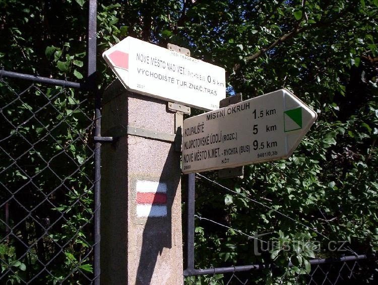 Orientační místo a rozcestí na červené turistické trase ve východní části Nového Města nad Metují u Sokolovny.