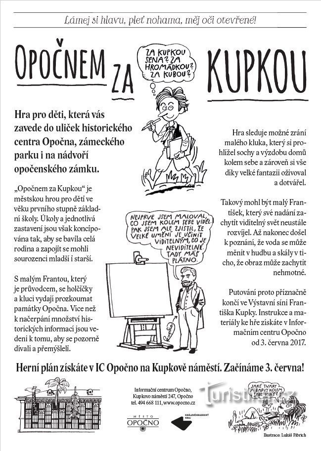 Opočnem za Kupkou, aneb lámej si hlavu, pleť nohama, měj oči otevřené je nová hra pro děti a jejich rodiče, věnovaná Františku Kupkovi, opočenskému rodákovi a světově proslulému českému malíři, grafikovi a zakladateli abstraktního malířství. Hra vás zábavnou formou zavede do uliček historického centra města, zámeckého parku i na nádvoří opočenského zámku. Je městskou hrou pro děti ve věku od 6 do…