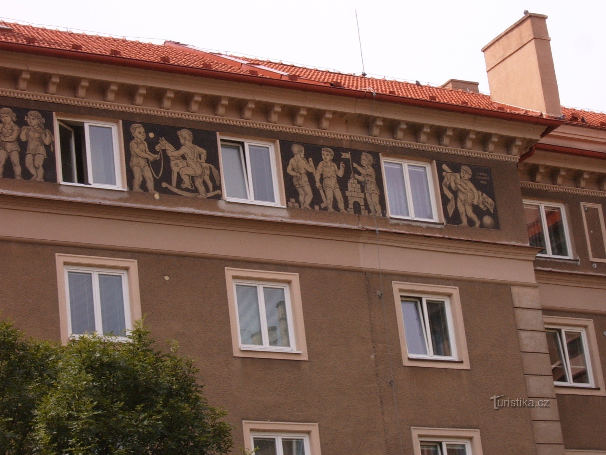 Jde o spojení bytových domů a obchodů s Věží nad průjezdem a figurálními sgrafity.