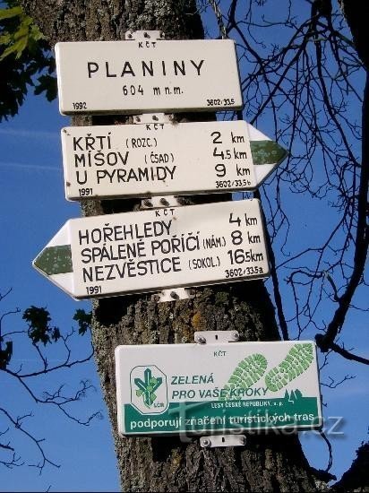 Rozcestník v obci Planiny, zeleně značená cesta směr Křtí a Míšov, na opačnou stranu směr Hořehledy a Spálené Poříčí.