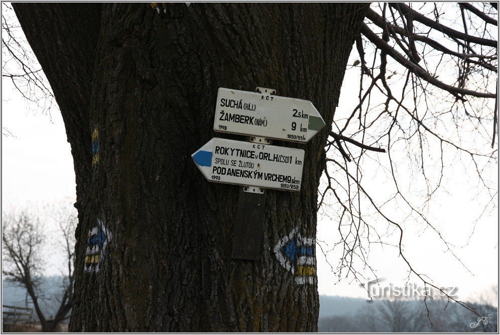 Rozcestí modré a žluté tur. značky nalézajíci se jižně od města Rokytnice v Orlických horách.