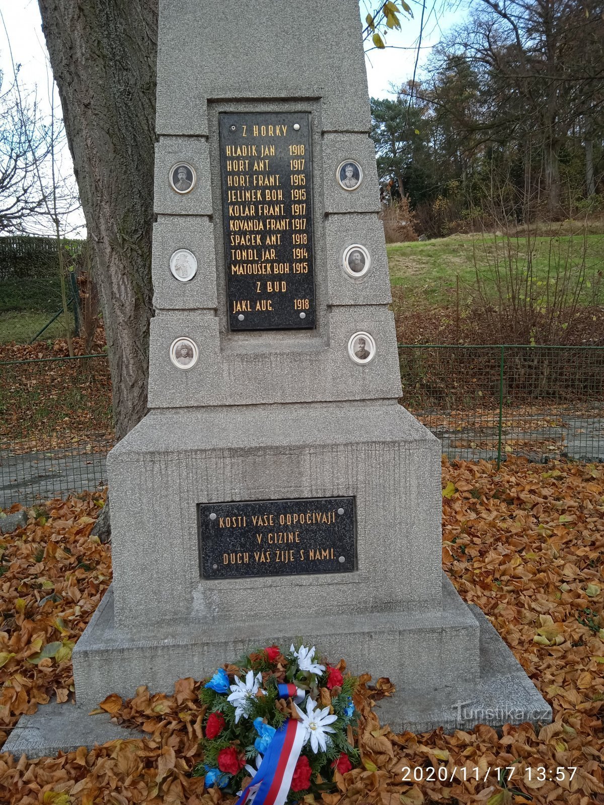 Pomník se nachází víceméně v centrální části obce.je na něm text:Z HORKYHLADÍK JAN 1918HOŘT ANT. 1917HOŘT FRANT 1915JELÍNEK BOH. 1915KOLÁŘ FRANT. 1917KOVANDA FRANT 1917ŠPAČEK ANT. 1918TONDL JAR. 1914MATOUŠEK BOH 1915Z BUDJAKL AUG. 1918KOSTI VAŠE ODPOČÍVAJÍ V CIZINĚDUCH VÁŠ ŽIJE S NÁMI
