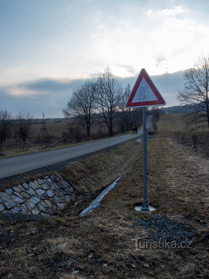 Nejspíš do kategorie kuriozit až poťouchlostí bychom mohli zařadit prazvláštní dopravní značku. Patrně neodpovídá žádnému vzoru Vyhlášky o silničním provozu. Dopravní policista by ji nejspíše neschválil, možná by i nařídil okamžité odstranění. Naštěstí je taková značka k vidění na silničce mezi Šumperkem a Bludovečkem, v místě kde se stýkají katastry Šumperka a Bludova.