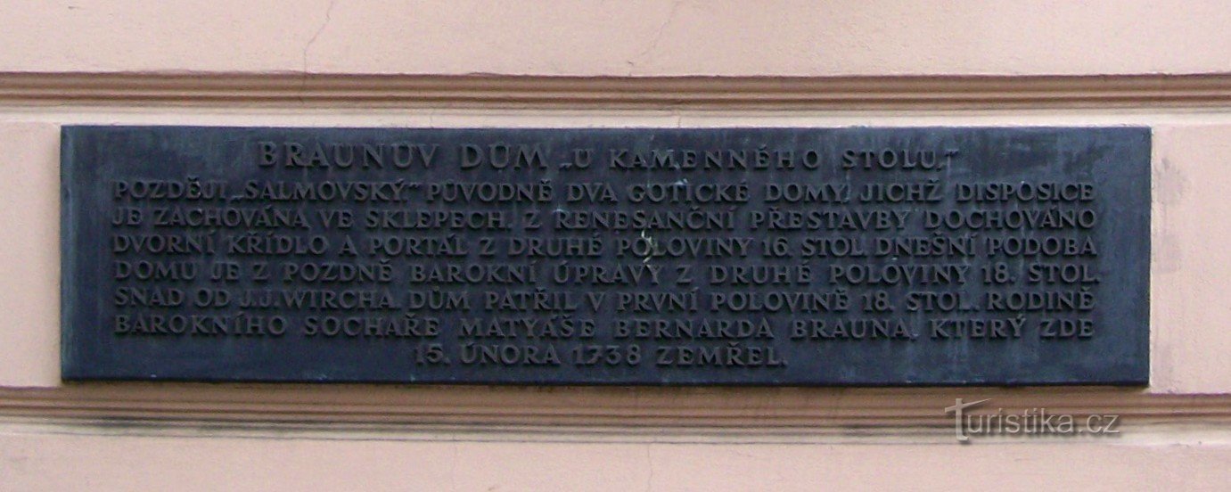 Palác U kamenného stolu s gotickými sklepy, přestavován renesančně a barokně, do dnešní klasicistní podoby byl upraven někdy Kolem roku 1820.Prvně je dům připomínaný roku 1377. Roku 1714 jej koupil M.B.Braun (dům nese též označení Braunův dům). Až patrně v šedesátých letech osmnáctého století došlo k pozdně barokní přestavbě.