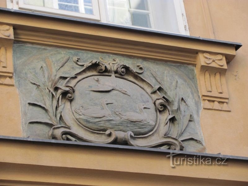V Husově ulici raně barokní portál a domovní znamení, nároží chráněné patníkem v podobě kalicha.