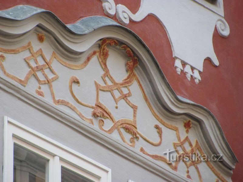 V průčelí do Husovy ulice dochovaný renesanční bosovaný portál. Bohatá štuková výzdoba.