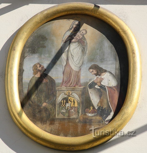 Mezi prvním a druhým patrem malované domovní znamení, dílo…