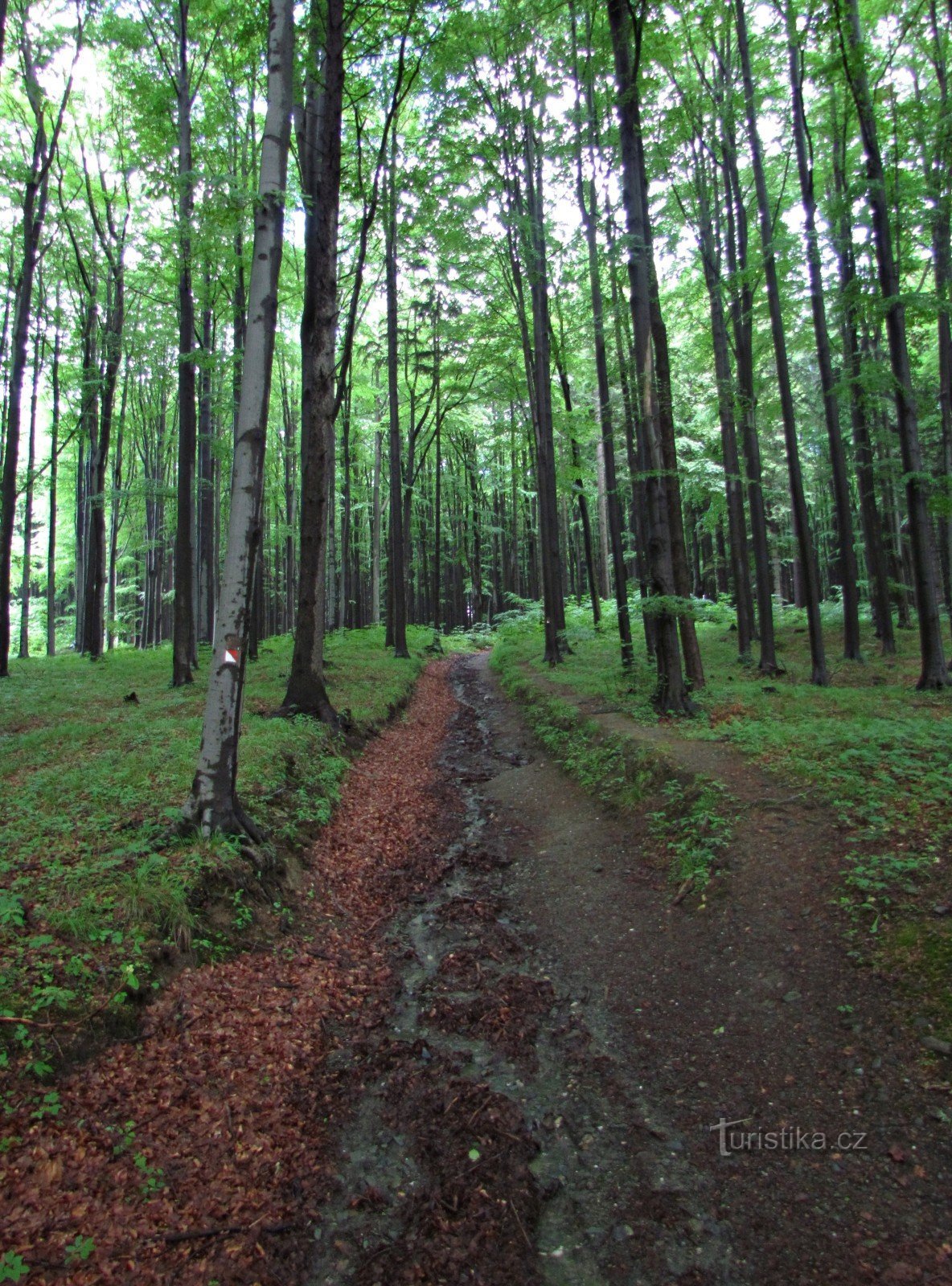Pokud u novodobějšího poutního kostela Panny Marie Pomocné neodoláte značení Hornické naučné stezky, směřující za tajemstvími Příčného vrchu, čeká vás nejprve poměrně prudké stoupání lesem na hřeben. Tady narazíte na tur.rozcestník, neboť se tu k naší trase připojuje modrá značka, šplhající sem nahoru ze Zlatých Hor přes zříceniny Edelštejna. Obě značení pak spolu vesele pokračují směrem k…
