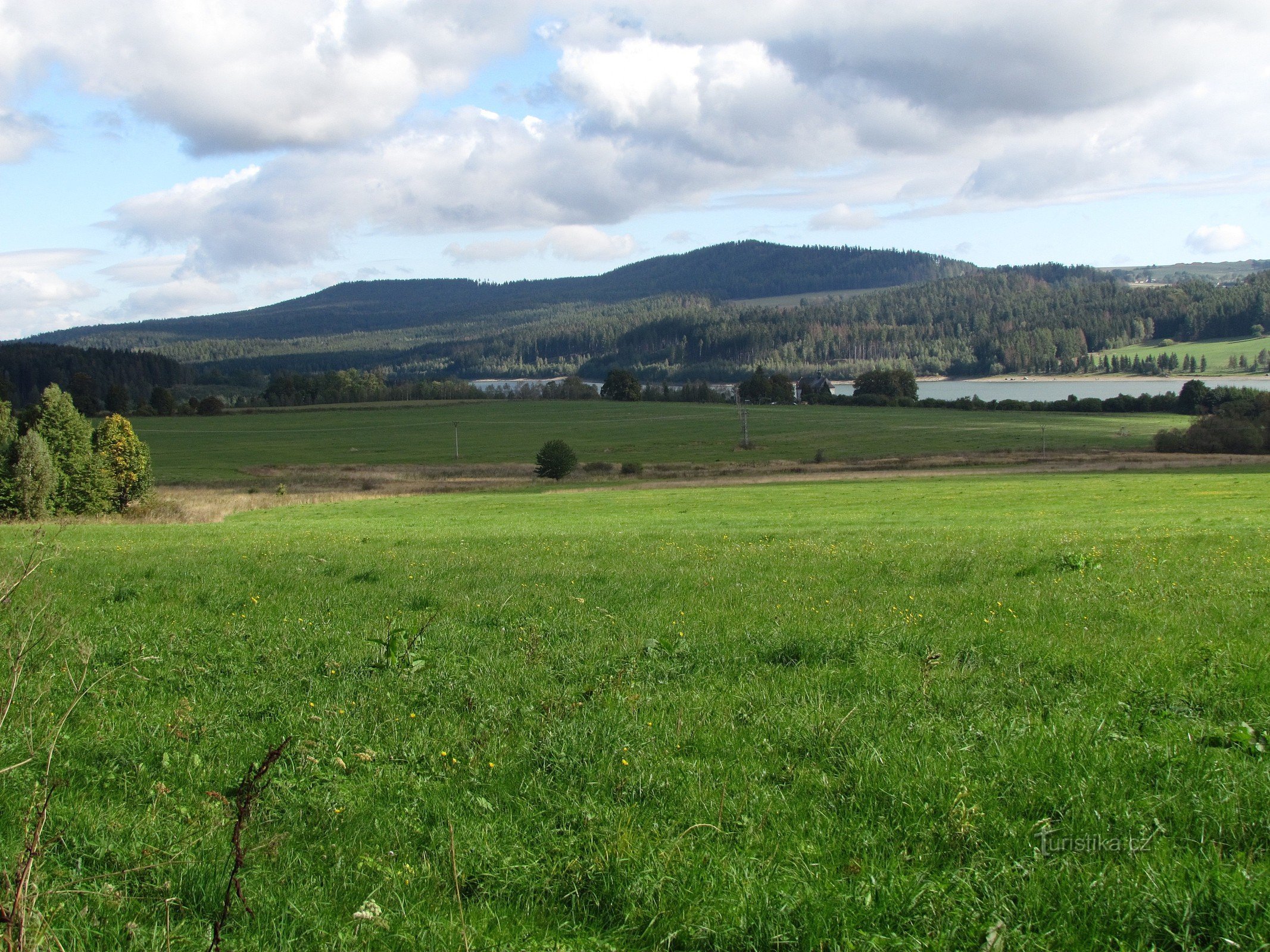 Zelená turistická trasa stoupá od rekreačního místa Nová Pláň do úbočí Vysokého kamene a v místech, kde se značka vyhoupne na travnatý hřeben, se nachází velmi zajímavá přírodní vyhlídka. Vlastní zalesněný hřeben se nachází ještě vysoko nad námi, ale ten nás nezajímá, neboť směrem severním, východním a západním se našim zrakům otevírá úžasný vyhled. Jeho ústředním motivem je plocha vodního díla…