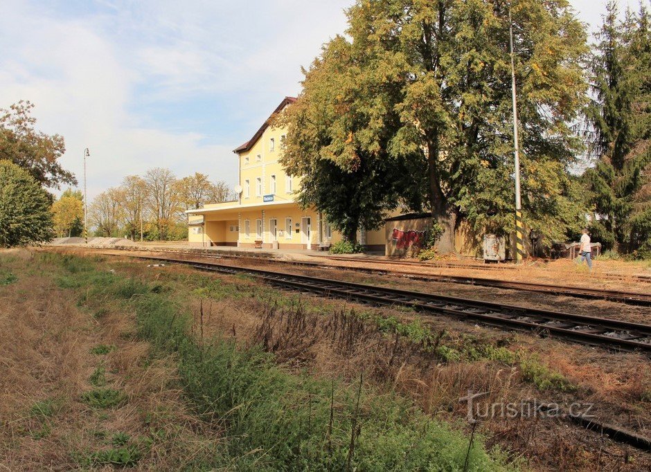 Místní nádraží je konečnou stanicí na regionální trati z Chrástu u Plzně. Překvapí velká budova, která je navíc opravena. Nádraží je vzdálené přibližně jeden kilometr od středu města a dá se říci, na jeho nejvyšším místě. Tabulka na budově uvádí nadmořskou výšku 402 metrů. Vlaků tady sice moc nejezdí, ale třeba spojení s nedalekou Plzní je dobré. Proti nádraží je větší zemědělský objekt. V okolí…