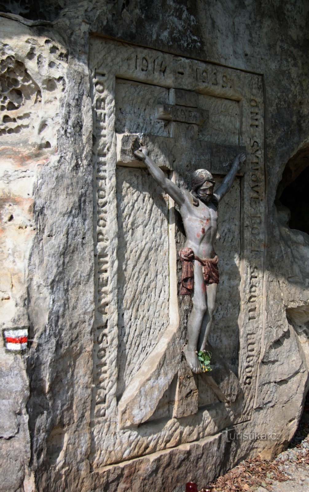 Vytesáný reliéf ukřižovaného Krista.