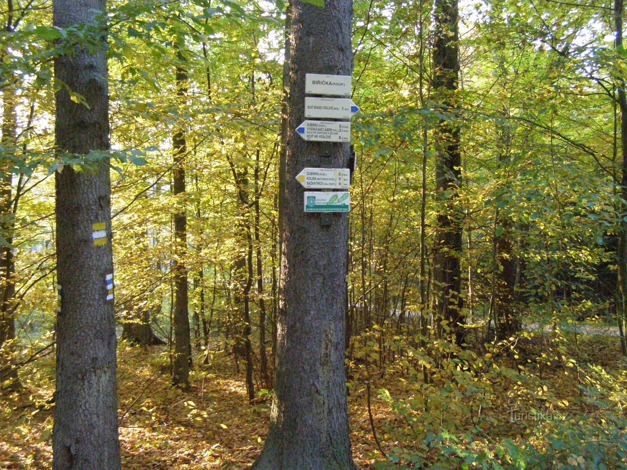 Rozcestí u známého lesního rybníku Biřička ukazuje cestu ve směru Nový Hradec Králové - Bažantnice po značce žluté, značka modrá ukazuje cestu ve směru Nový Hradec Králové mhd - hájovna u Vysoké nad Labem. Rozcestník se nachází cca 100 metrů jižně za hrází rybníku.