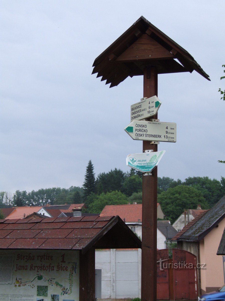 Turistický rozcestník v centru Divišova u kostela sv. Bartoloměje neoznačuje ani tak rozcestí, jako spíše upřesňuje směr zde procházející značené trasy. Jde o zeleně značenou turistickou trasu, která do Divišova přichází od jihu z Bílkovic a pokračuje na sever na Drahňovice a dál k údolí řeky Sázavy. Rozcestí na Tyršově náměstí v Divišově však můžete využít i jako výchozí místo naučné stezky…