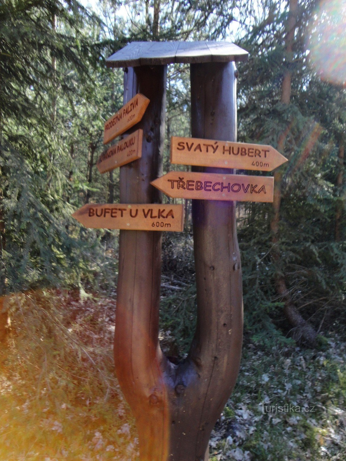 Pod tímto podivným názvem se skrývá rozcestí, které bylo vybudováno Městskými lesy HK v křižovatce lesních cest nedaleko známé asfaltové stezky Hradečnice. Nejedná se tedy o turistický rozcestník, které zřizuje KČT. Směrníky zde ukazují cestu do několika směrů, k lesní komunikaci Třebechovka, k Pánovu palouku, k bufetu U Vlka a ke sv. Hubertu.