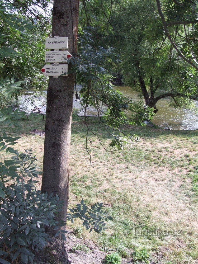 Turistický rozcestník s názvem Na Marjánce najdeme u místní silnice u řeky Sázavy před zdejší vyhlášenou stejnojmennou restaurací. Šipky rozcestníku upozorňují kolemjdoucí na průchozí směr červeně značené turistické trasy, která kopíruje tok řeky Sázavy. Pokud se vydáte proti proudu řeky, dojdete do města Sázava, nebo třeba přes Rataje až do Českého Šternberka. Opačným směrem vede červené značení…
