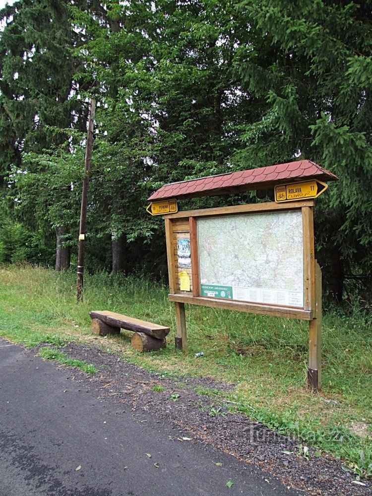 Rozcestník umístěný před železničním nádražím v Nových Hamrech stojí na žlutě značené turistické trase, která okolo nádraží prochází od severu na jih. Pokud se po žluté vydáte směrem na jih, dojdete přes rozhlednu Pajndl na Tisové hoře až k železniční stanici Nové Hamry - zastávka (dříve pod názvem Nejdek - Sejfy). Když po žluté sejdete severním směrem na náměstíčko v Hamrech, můžete se dál podle…