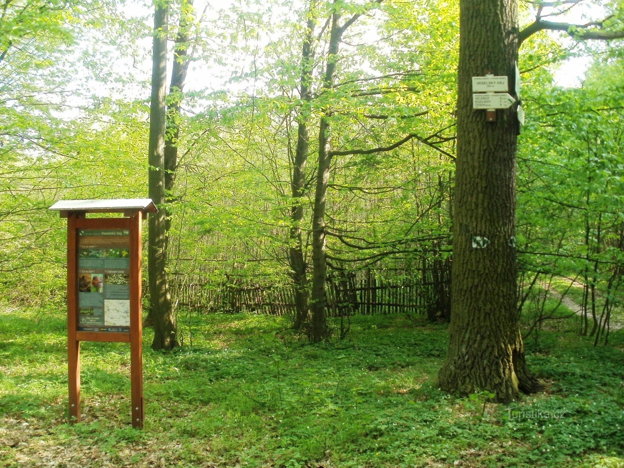 Turistický rozcestník NS Češov-Vysoké Veselí, který se nachází v lesní křižovatce ve Veselském háji, ukazuje turistům cestu do Češova dvěma směry, přes Velešice, Kozojedy a přes Vysoké Veselí.