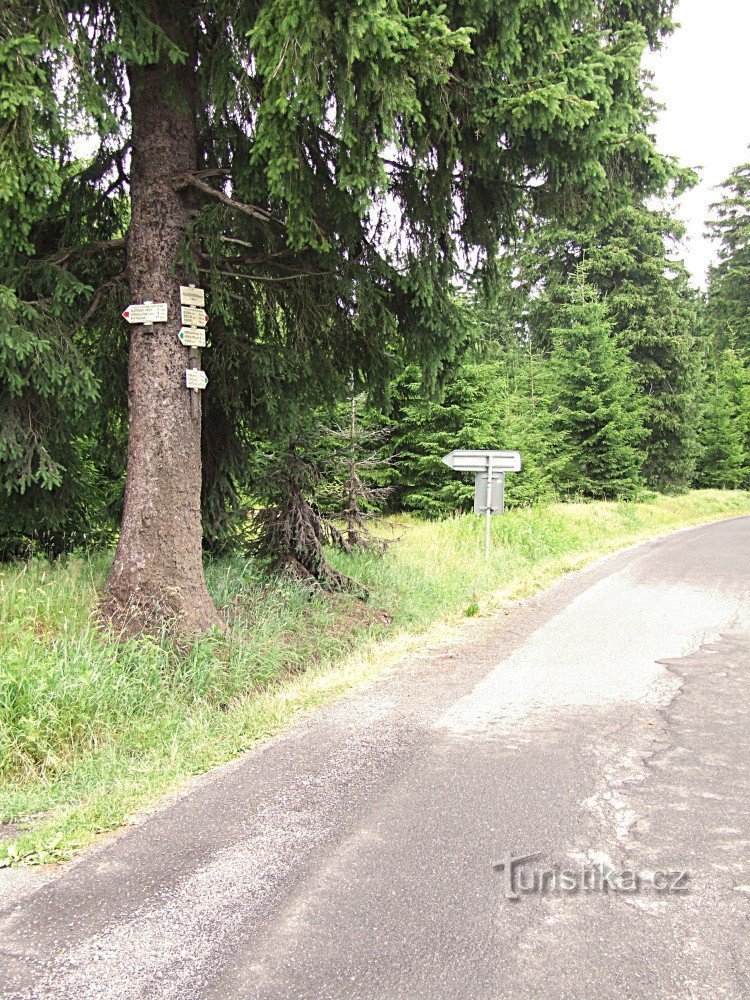 Rozcestím při hlavní silnici z Horní Blatné na Ryžovnu v místě odbočky na Blatenský vrch prochází dvě turisticky značené trasy. Po červené turistické značce se severním směrem dostaneme přes Blatenský vrch okolo rozhledny do Horní Blatné a dál přes Jelení a Rolavský vrch k Rájeckému údolí a do Kraslic. Opačným směrem po silnicí podle červené dojdeme na Hřebečnou, odkud můžeme pokračovat až do…