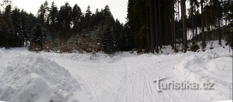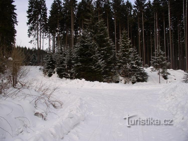 Rozzcestí na MTZ vedoucí ze Štok na Vysoký Kámen v místě, kde tato cesta křižuje lesní cestu podél Zvonějovského potoka.
