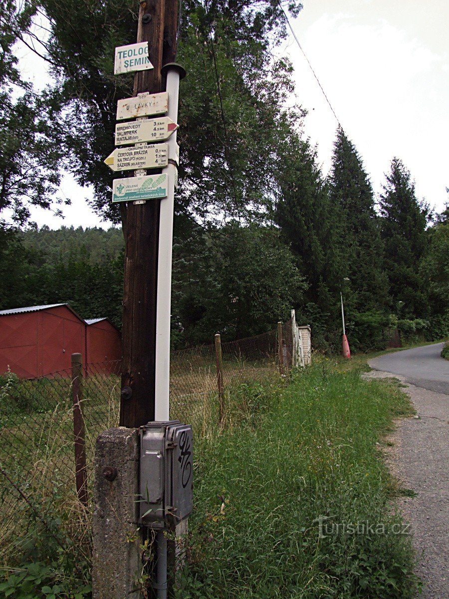 Rozcestník stojící kousek od severního konce můstku pro pěší přes řeku Sázavu upřesňuje směr dvou turisticky značených cest. Žlutě značená trasa, která tudy prochází, je vlastně vyhlídkovou stezkou a slouží jako poznávací okruh po městečku Sázava a přilehlého okolí. Červená trasa sem přichází od Černých Bud kolem sázavského kláštera a pokračuje dál přes Talmberk a Rataje nad Sázavou k Českému…