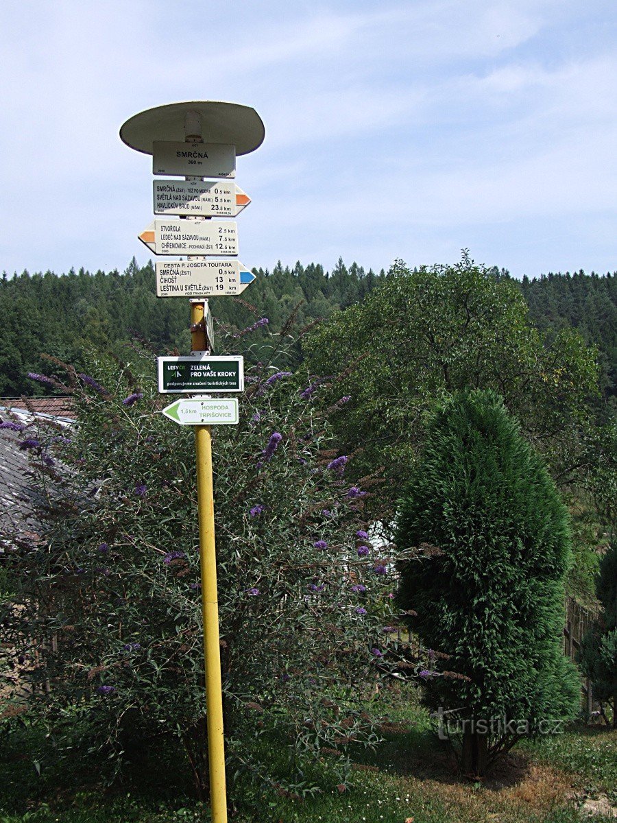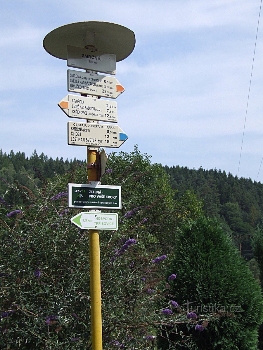 Šipky rozcestníku stojícího na křižovatce místních komunikací na okraji osady Smrčná ukazují směr červené a modré turistické trasy. Obě trasy odtud směrem přes řeku míří společně až za železniční trať, kde se opět rozcházejí. Červená značka, která po celé své délce kopíruje údolí řeky Sázavy do Smrčné přichází od východu přes Světlou nad Sázavou od Havlíčkova Brodu a směřuje dál po proudu řeky…