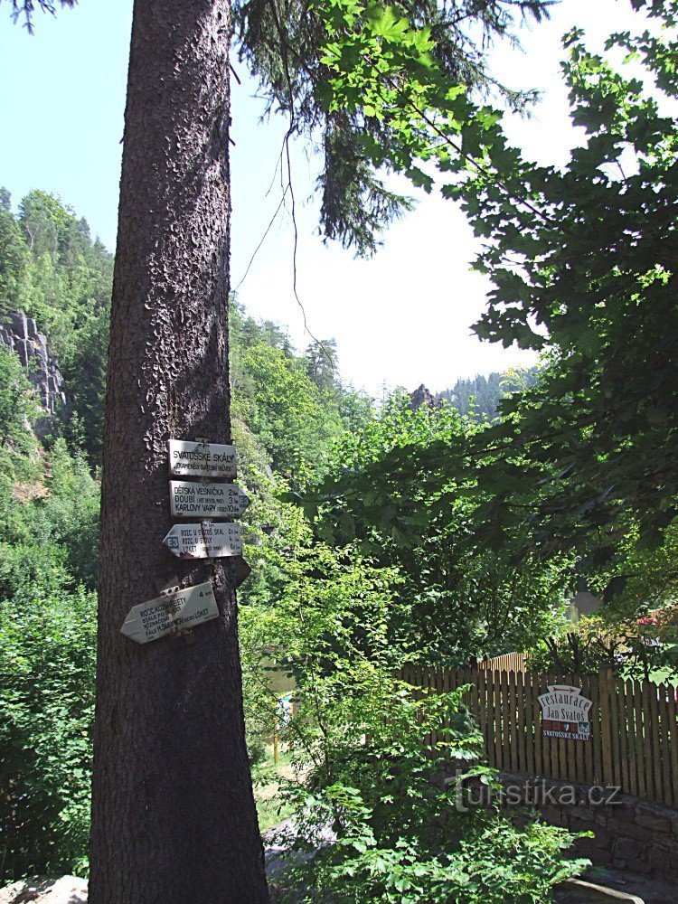 Rozcestník najdeme na letitém smrku mezi restaurací a lávkou přes řeku Ohři. Svůj výchozí bod zde má žlutě značená turistická stezka, která odtud směřuje k železničnímu nádraží Cihelny. Mimo krásného okolí zarámovaného Svatošskými skalami je rozcestí navíc zajímavé tím, že jím prochází Evropská dálková cesta E3, Atlantický oceán - Černé moře, která je na českém území vyznačena symbolem E3 v hrotu…