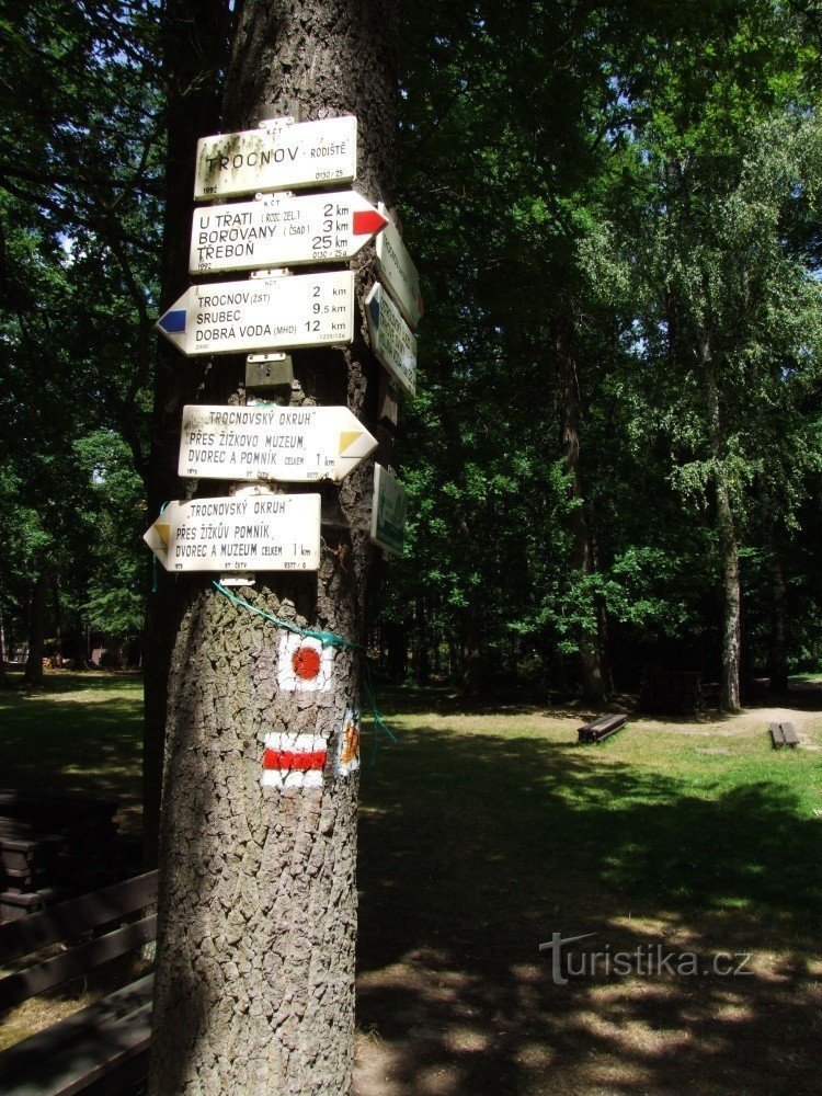 Rozcestník Trocnov - Žižkovo rodiště najdeme hned vedle místa Žižkova dvorce. Zdejším Rozcestím prochází dvě turistické trasy červená - z Borovan do Radostic (3,6km), modrá - ze Srubce až k rozcestí Nad Liščím dolem za Konraticemi (37km) a žlutá naučná stezka Žižkovým rodištěm v délce asi 2 km.