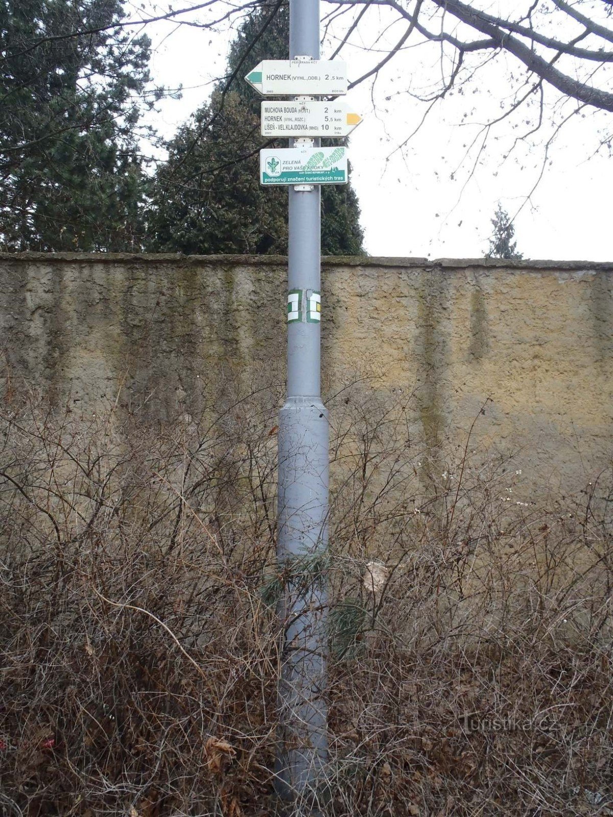 Začínají zde dvě turistické trasy. Zelená značka vede na rozcestí k vyhlídce Hornek (2,5km) a souběžně vede i naučná stezka.