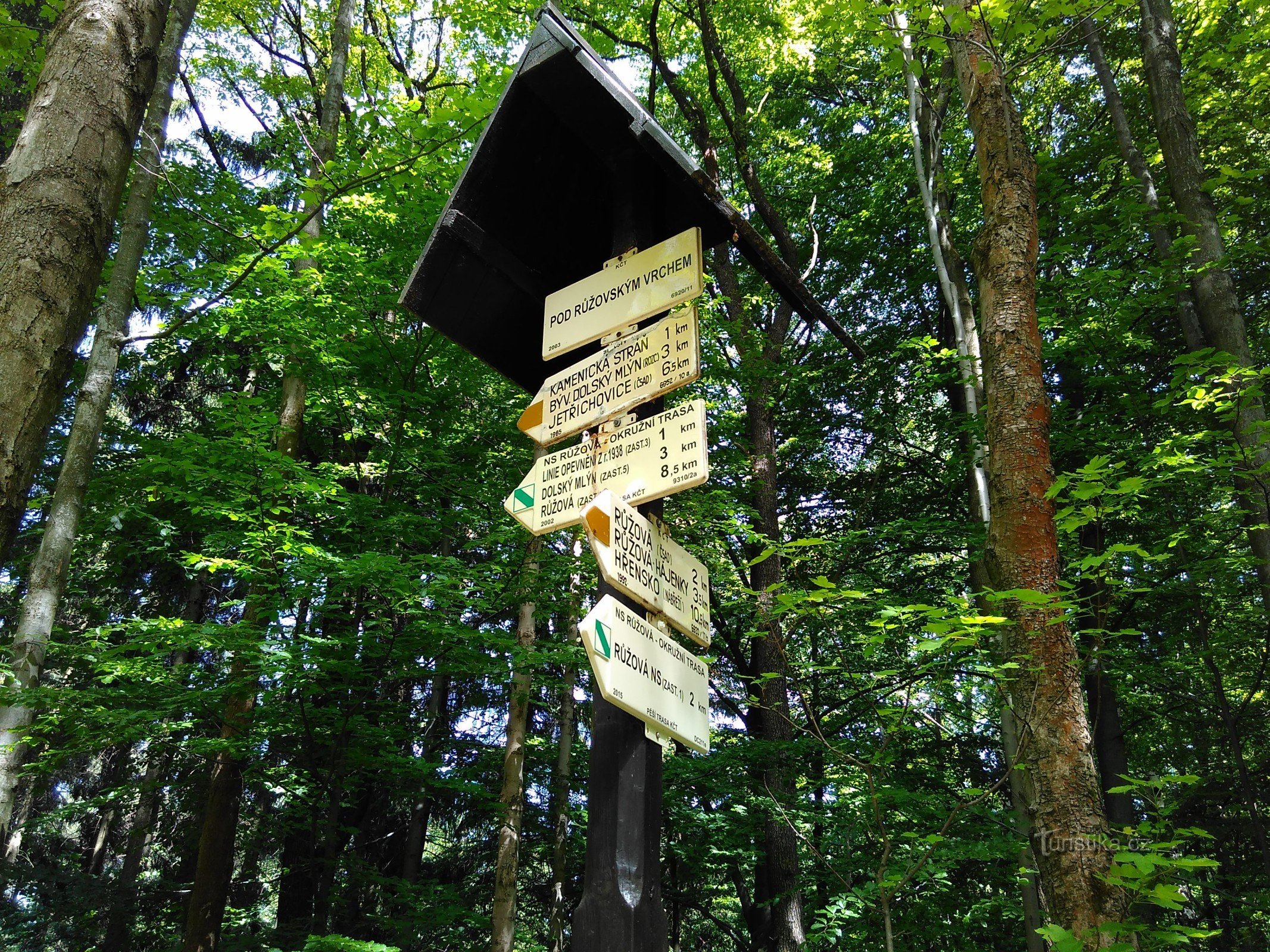 Začínáme na parkovišti u prvního stanoviště NS Růžová přímo pod Růžovským vrchem.Orientujeme se u rozcestníku a vyrážíme po žluté TZ mezi loukami k lesu.Po vstupu do lesa odbočíme z hlavní cesty Doprava a pěšinou vystoupáme terenní vlnu.Dorazíme k rozcestníku Pod Růžovským vrchem.