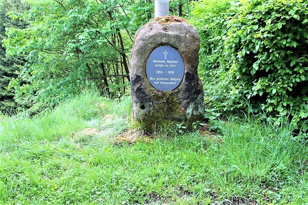 Pomníky padlým v první světové válce jsou skoro v každé obci. Některé jsou nepřehlédnutelné a mají i svoji cenu. Jiné v menších vesničkách se musí i trochu hledat. Ten, o kterém jsou tyto řádky, se nachází ve výše uvedené vsi, u silnice ze Chřibské do Jetřichovic Je to hrubě opracovaný kámen, ve kterém je vložena oválná deska s jednoduchým nápisem. Jednoduchost, která dokáže dojmout. No posuďte…