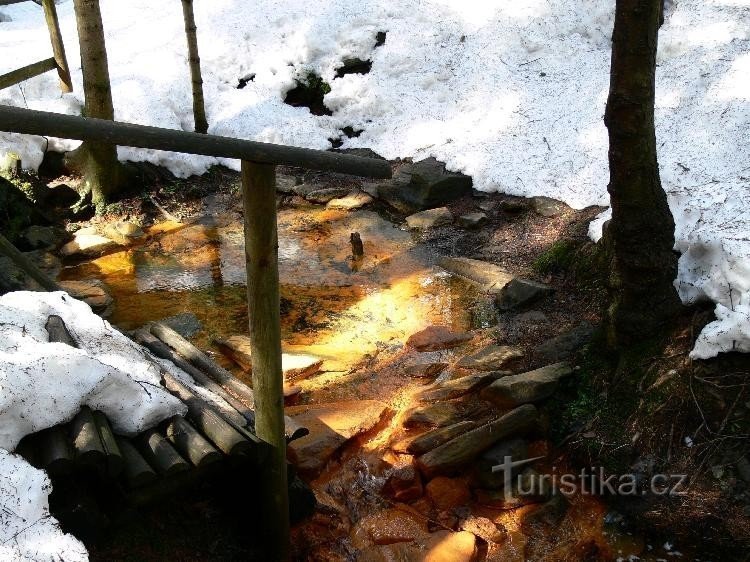 Nedaleko od rozcestí je na levém břehu Hamerského potoka vydatné okrouhlé prameniště železité vody se žlutohnědým povlakem, podle něhož je tradičně nazýváno Sirný pramen, ačkoliv jev se sírou nijak nesouvisí. V železité vodě žije bakterie Leptothrix ochracea, která shromažďuje železité sloučeniny a vytváří rezavé kašovité shluky. K prameni vede po dřevěných můstcích upravená odbočka ze zelené…