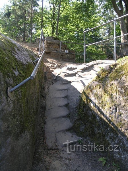 Poprvé je zmiňován roku 1372, nazývaný byl Husí nůžka. V pozdějších letech patrně loupežnickým sídlem a proto vypálen. Do dnešních dnů se tak dochovali jen části vytesané do skály a část zdí věže. V té byly nalezeny české groše z doby Václava IV.