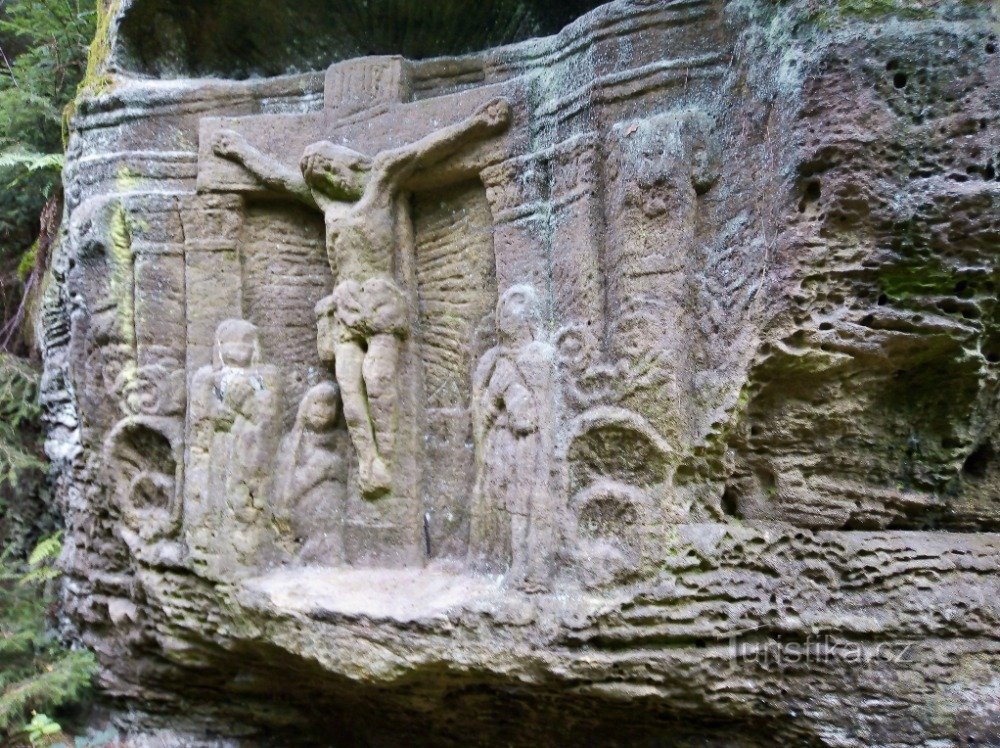Půvabný skalní reliéf Kalvárie se nachází na půli cesty mezi obcemi Vojtěchov a Jestřebice - tedy na středočeském Kokořínsku - a rozhodně stojí za vidění. Jeho atraktivitu ještě zvyšuje skutečnost, že v blízkosti tohoto pozoruhodného díla neznámého umělce najdeme mnohé přírodní zajímavosti v čele se skalními Jestřebickými pokličkami, Vojtěšským dolem a Černou dírou.